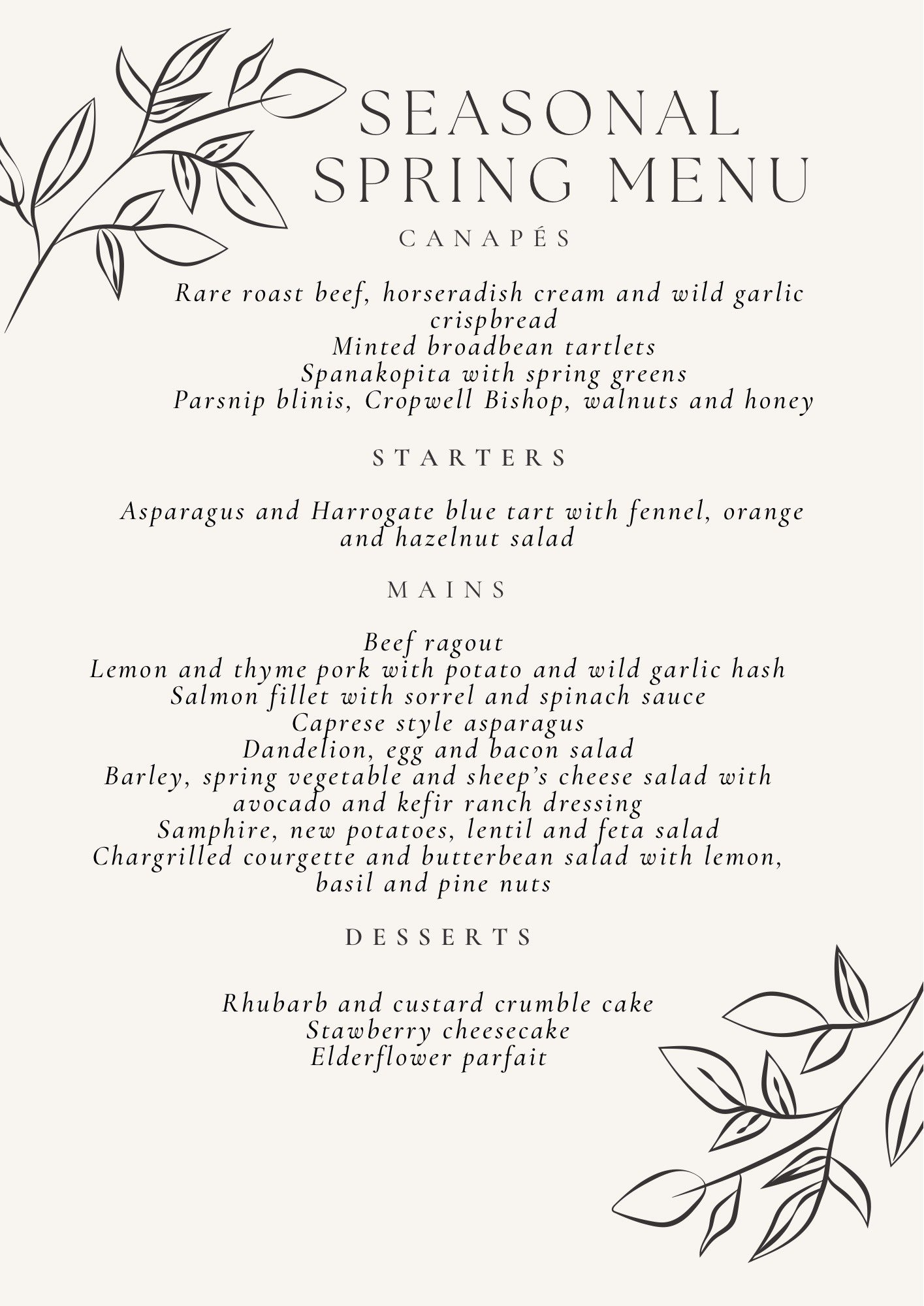 Brickhill Bistro offers a seasonal spring menu that incorporates all the elements of spring with meat, vegatarian an vegan options. The ingredients are sourced locally and where possible foraging for wild plants such as wild garlic. The menu can be adapted to include Easter options.